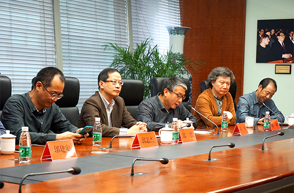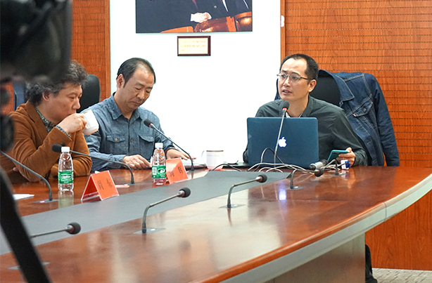 (左一:本屆雙年展中國(guó)館策展人邱志杰、左二:文化部外聯(lián)局局長(zhǎng)助理鄭浩、右二:中國(guó)美術(shù)家協(xié)會(huì)《美術(shù)》雜志社社長(zhǎng)兼主編尚輝)
