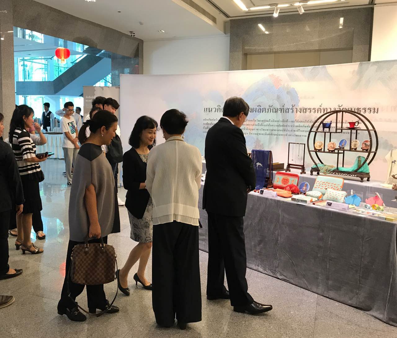 泰國(guó)前副總理、泰中友好協(xié)會(huì)會(huì)長(zhǎng)功·塔帕朗西,中國(guó)駐泰國(guó)大使館文化參贊陳疆,曼谷中國(guó)文化中心主任藍(lán)素紅、副主任張波,曼谷輝煌區(qū)政府區(qū)長(zhǎng)素七·阿利巴查披龍,文化部外聯(lián)局代表、造物記展覽團(tuán)團(tuán)長(zhǎng)韓立昕,國(guó)家博物館、故宮博物院、中國(guó)對(duì)外文化集團(tuán)及泰國(guó)工商界代表、商場(chǎng)代表、藝術(shù)愛(ài)好者等中泰嘉賓出席此次開(kāi)幕式。