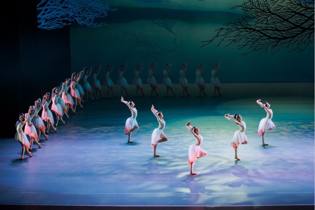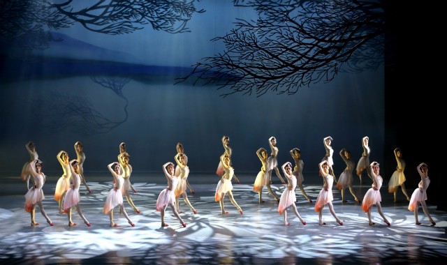 男女主人公的雙人舞造型無(wú)不具有戲曲優(yōu)美程式的因素,絕不是西方經(jīng)典的王子(美男)與公主(美女)雙人舞的簡(jiǎn)單復(fù)制。在他們的雙人舞中,相向進(jìn)退的設(shè)計(jì),既體現(xiàn)了朱鹮“高蹈派”的自然屬性,又表現(xiàn)了他們和諧的甜蜜。這仿佛是信手拈來(lái),其實(shí)是從生活中的煉制提取,真正做到了用舞蹈家的頭腦去支配雙腿。還是諾維爾說(shuō)的,“舞劇同一幅好畫(huà)很相似,也許它本身就是一幅圖畫(huà)”。