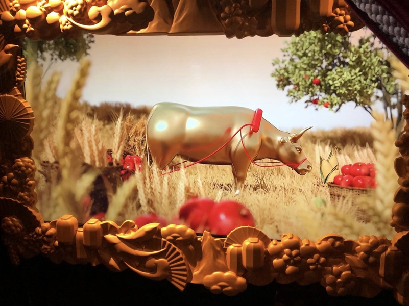 “五谷豐登”櫥窗主題色為麥浪金。滿眼的累累碩果讓人忍不住想伸手一摘,甜香的桂花仿佛一瞬間沁人心脾,勤勤懇懇的耕牛最后出現在畫面中央,不失為一幅田野豐收圖。